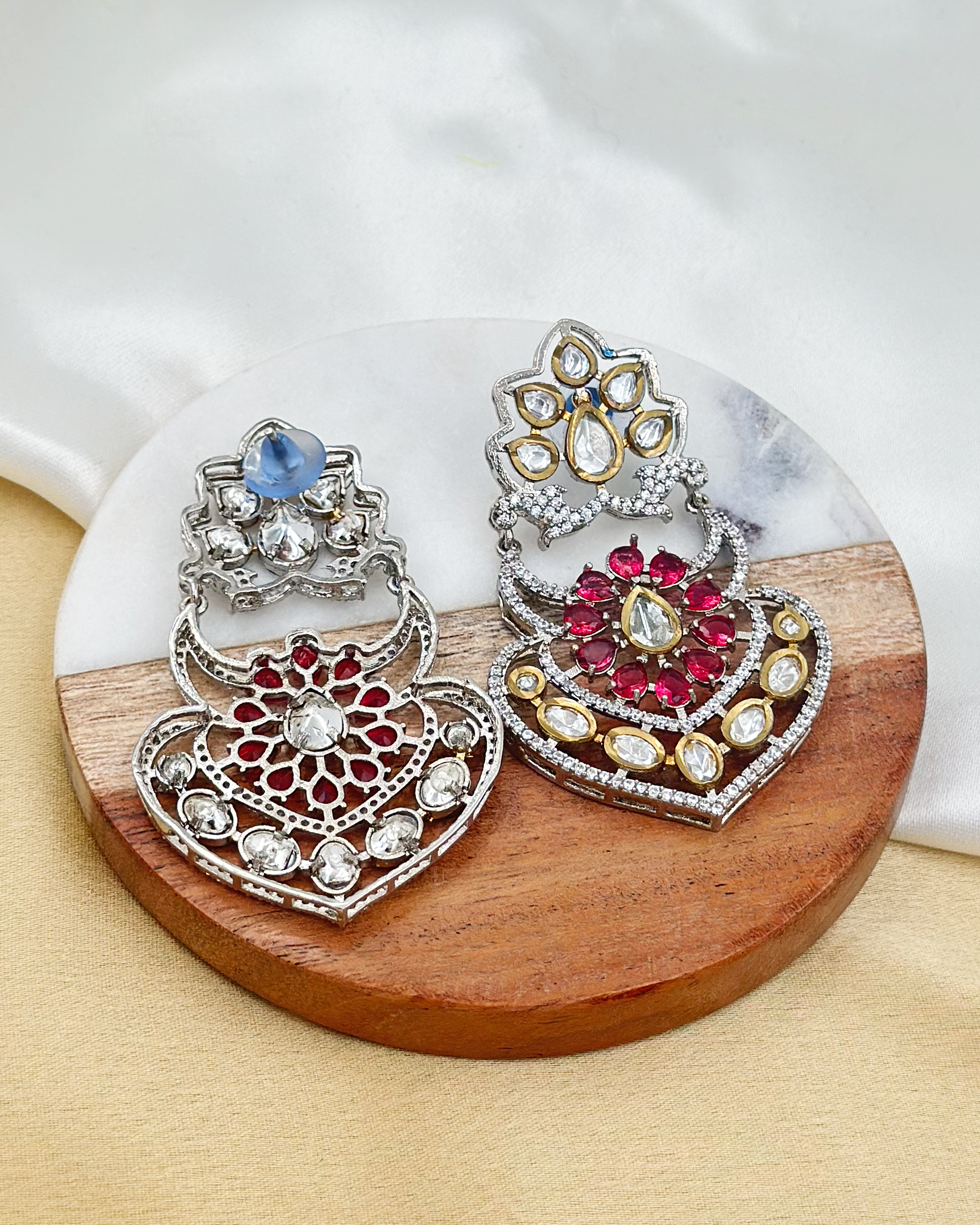 Indulge in the exquisite beauty of the Alisha earrings, a masterpiece crafted with the finest polki and uncut diamonds.  These earrings are a testament to timeless elegance, combining the lustrous charm of polki with the sparkling brilliance of uncut diamonds.