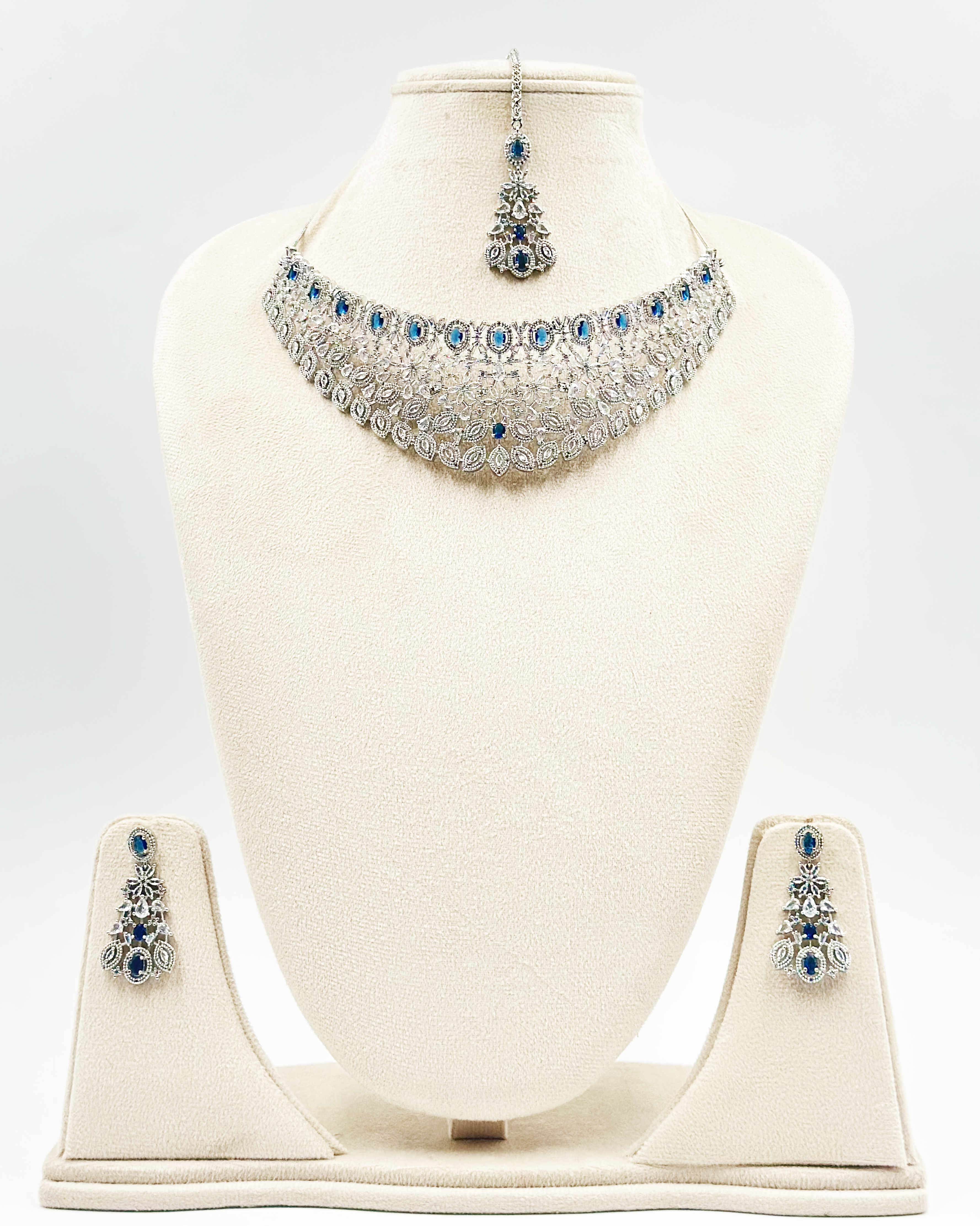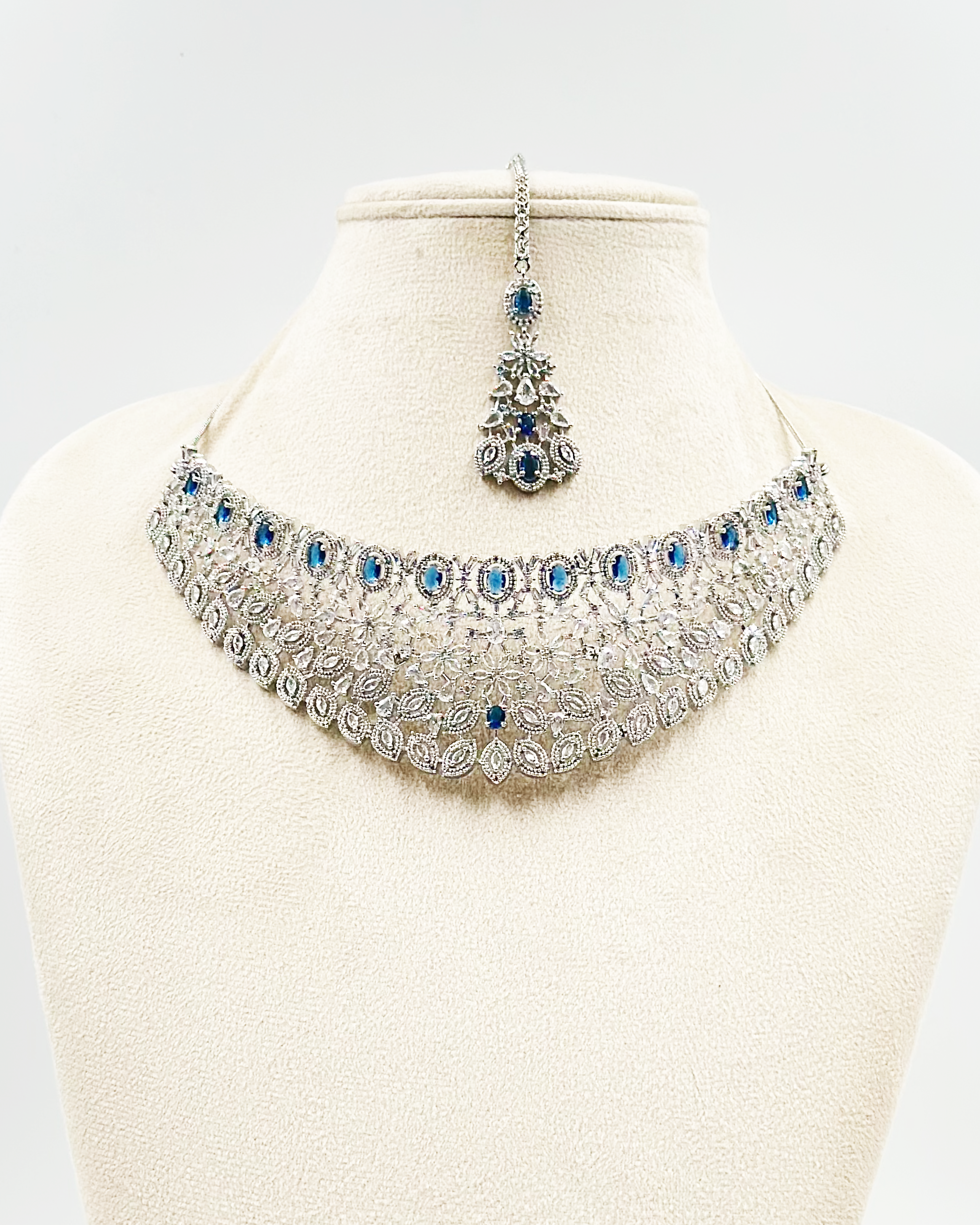 The Aliza necklace is a stunning piece that embodies the essence of a choker necklace Its intricate design features a captivating blend of blue stones and shimmering white stones, arranged in a captivating choker pattern.