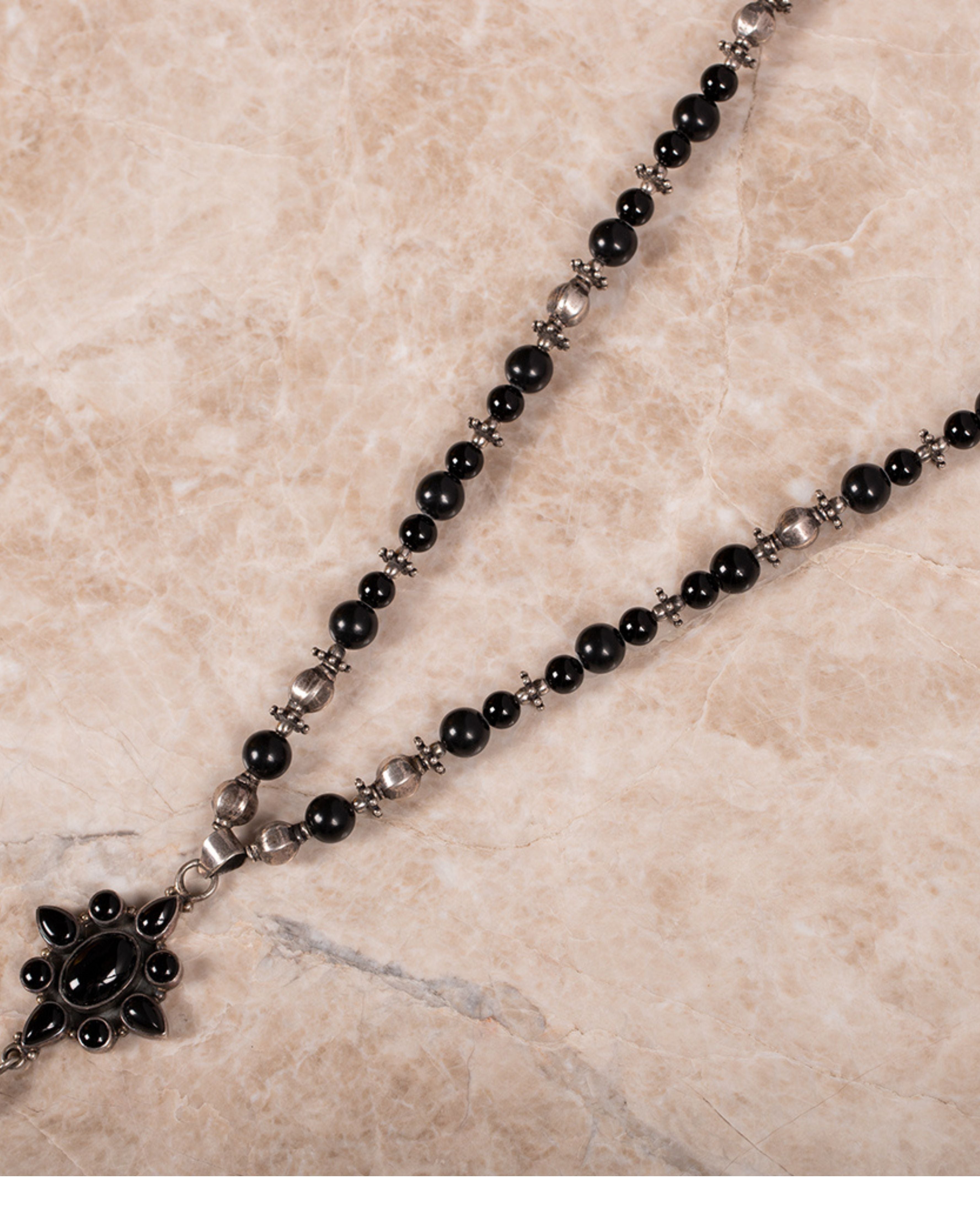 A single string of natural Black Onyx and silver beads necklace with a beautiful pendant in floral shape set in Sterling Silver.