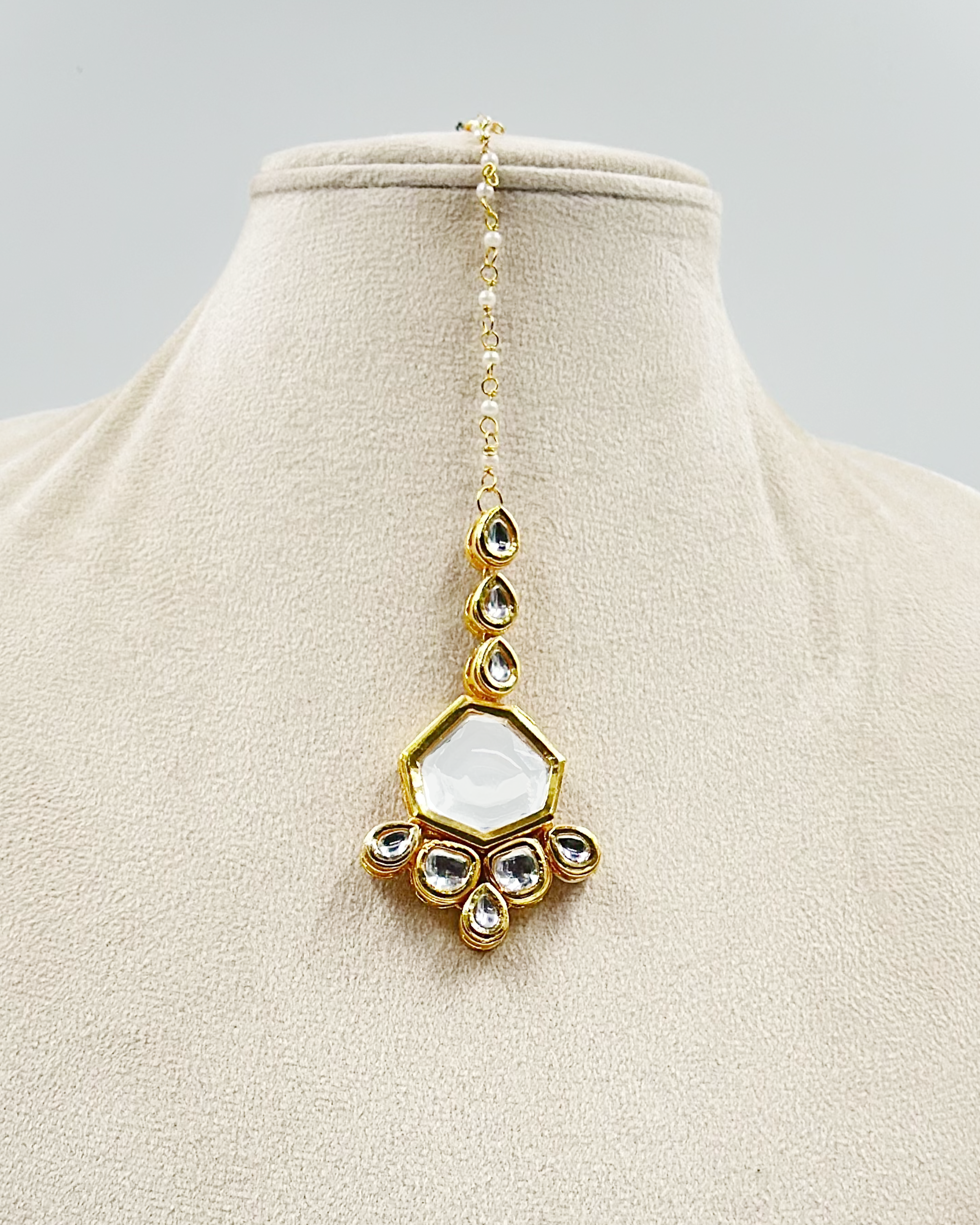 The intricate Rajwada pattern, adorned with shimmering kundan stones, exudes a timeless charm. The set includes a matching pair of earrings and a maang tikka which makes it perfect for special occasions or everyday wear.