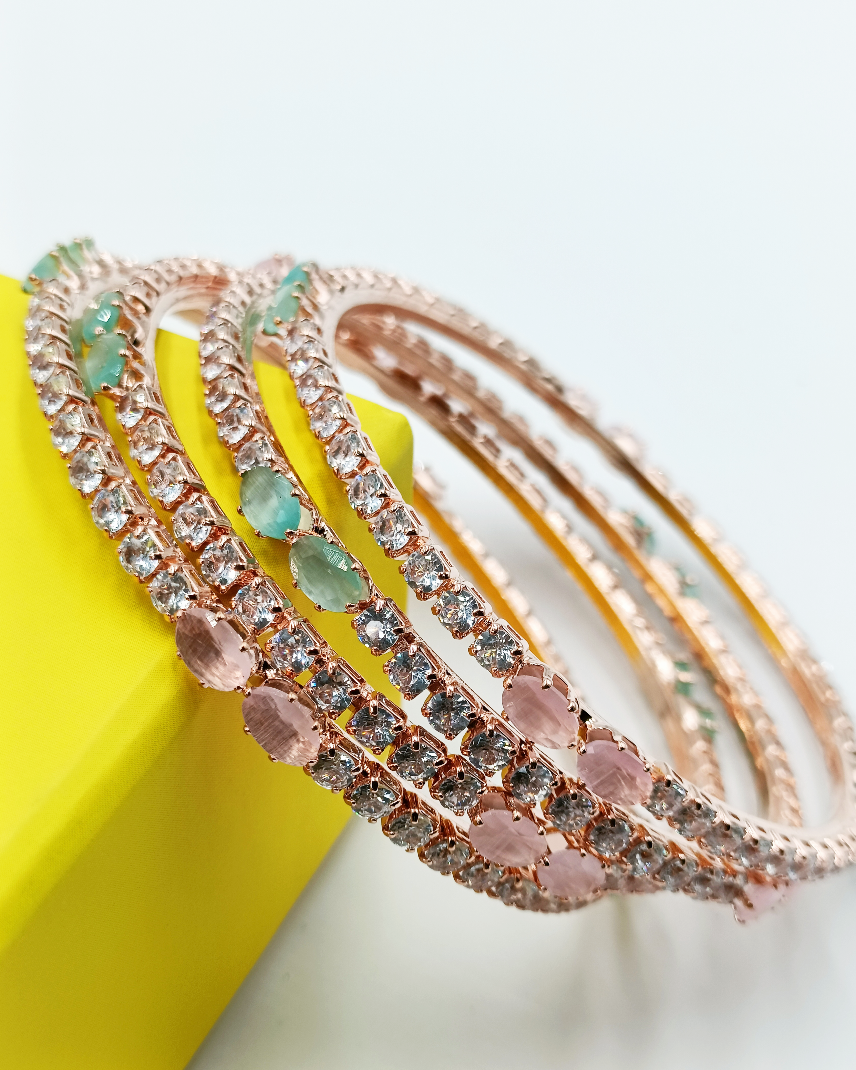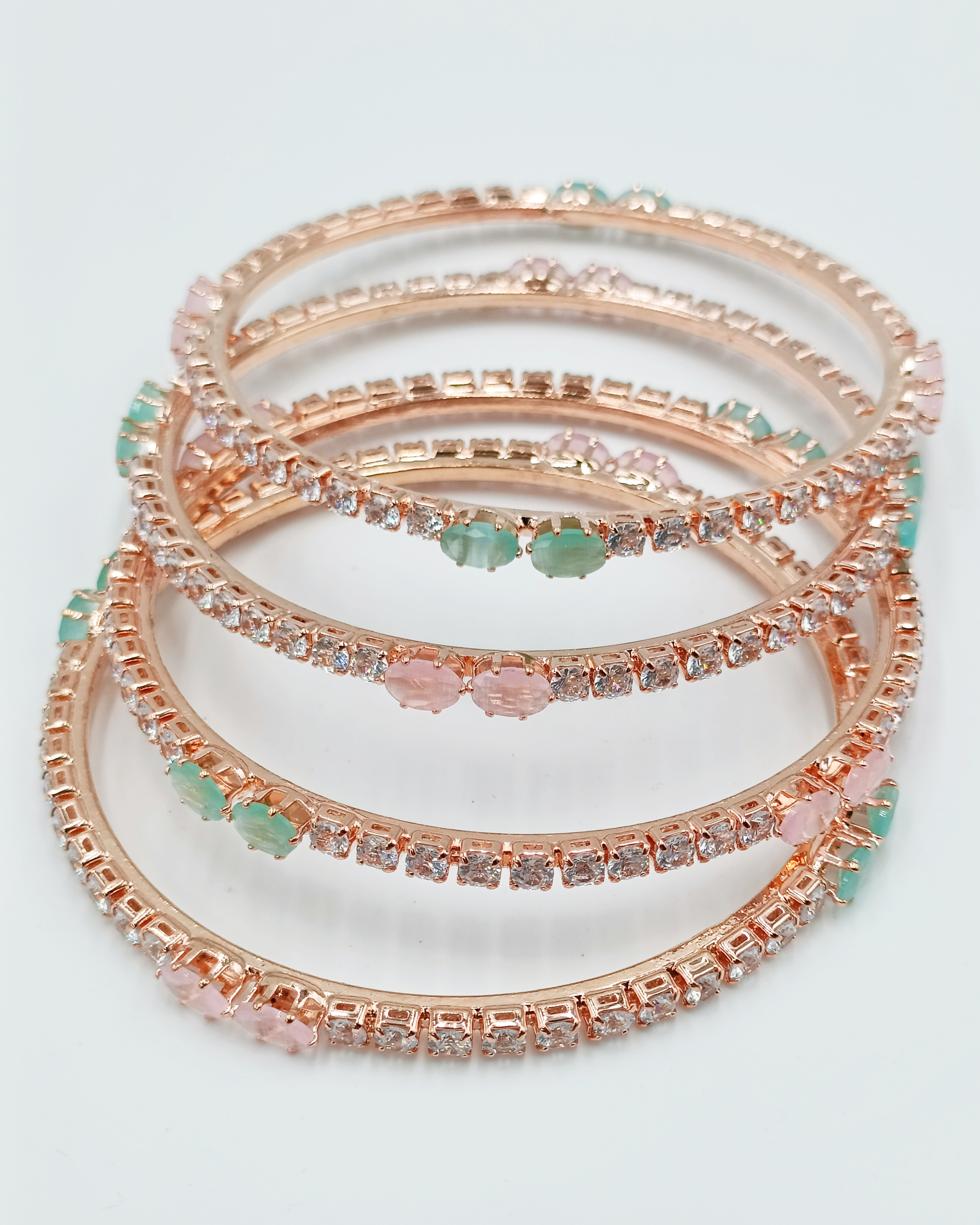 Crafted with exquisite pink and light green stones, these bangles offer a captivating blend of colors and textures.