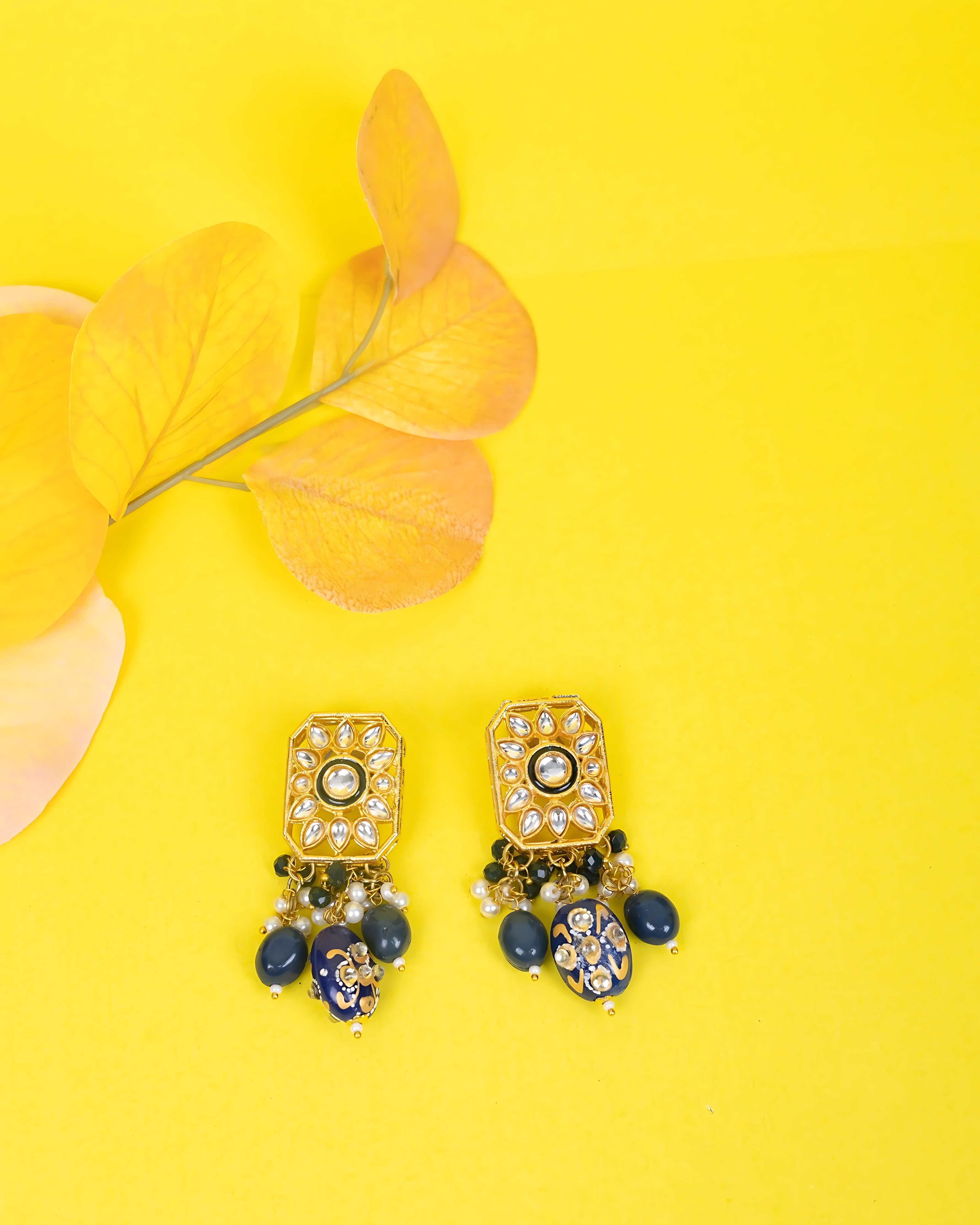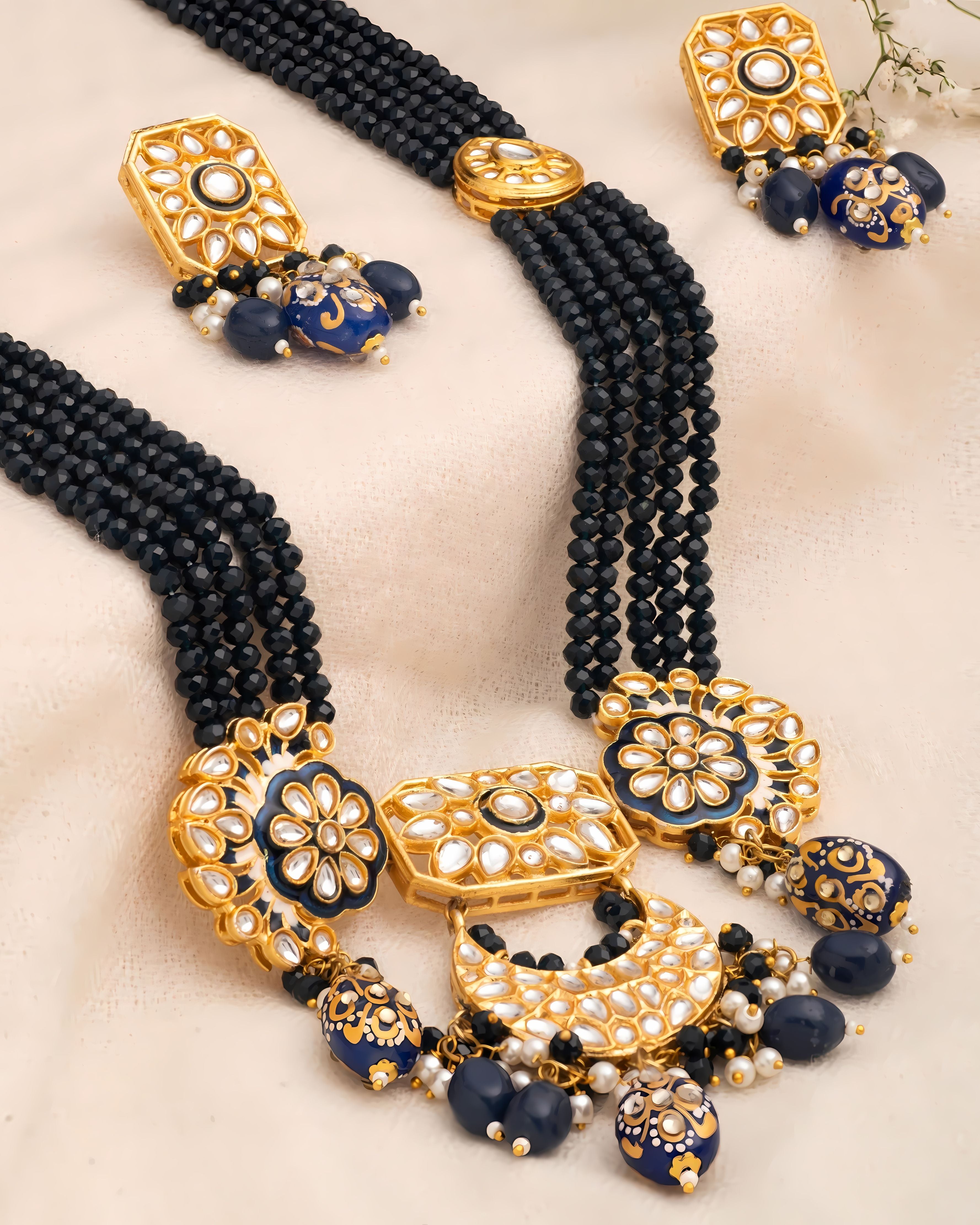 ✨ Inaayat Necklace Elevate Your Style: The Inaayat Necklace is a majestic ensemble of lustrous blue beads, intricate polki diamond work, and hand-painted embellishments. Unparalleled Sophistication: Step into a realm of elegance with this stunning amalgamation of craftsmanship and beauty. Captivating Layers: Comprising five layers of resplendent blue beads, this necklace mesmerizes with its enchanting hue. Brilliant Centerpiece: The grand neckpiece features intricate polki diamonds, each facet reflecting light with unmatched brilliance. Ethereal Charm: Hand-painted details and the shimmering luster of the beads add a touch of charm to the ensemble. Majestic Aura: Cascading gracefully, it exudes an aura of majesty and refinement, befitting royalty. Complete Ensemble: Accompanied by matching studs embellished with polki and blue stones, the Inaayat Necklace epitomizes luxury and sophistication. Memorable Statement: Perfect for grand galas or cherished as a prized possession, this masterpiece leaves a lasting impression. Specifications: Necklace - 120.90 GM; Earrings - 27.21 GM.