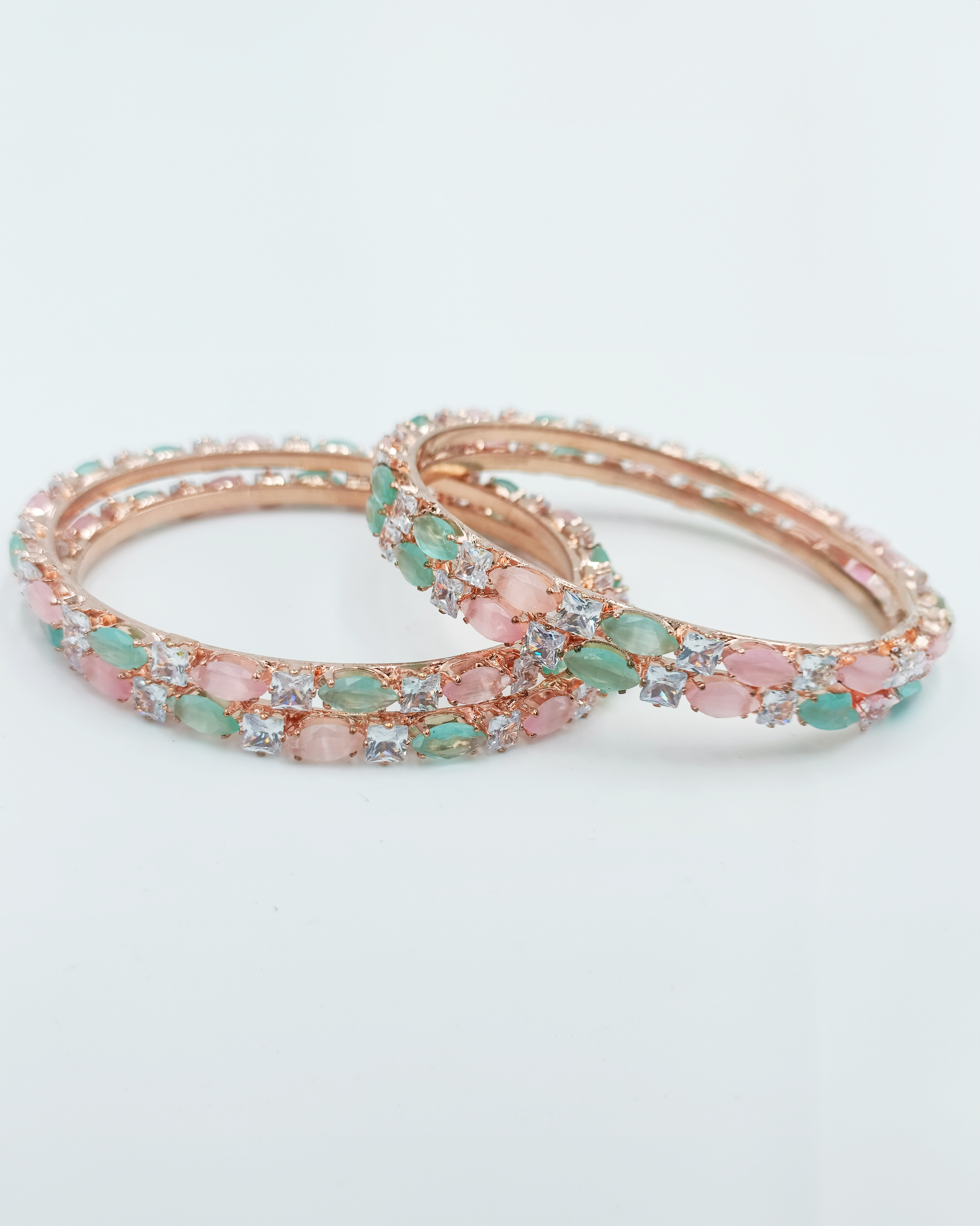 Crafted with exquisite pink and light green stones, these bangles offer a captivating blend of colors and textures.
