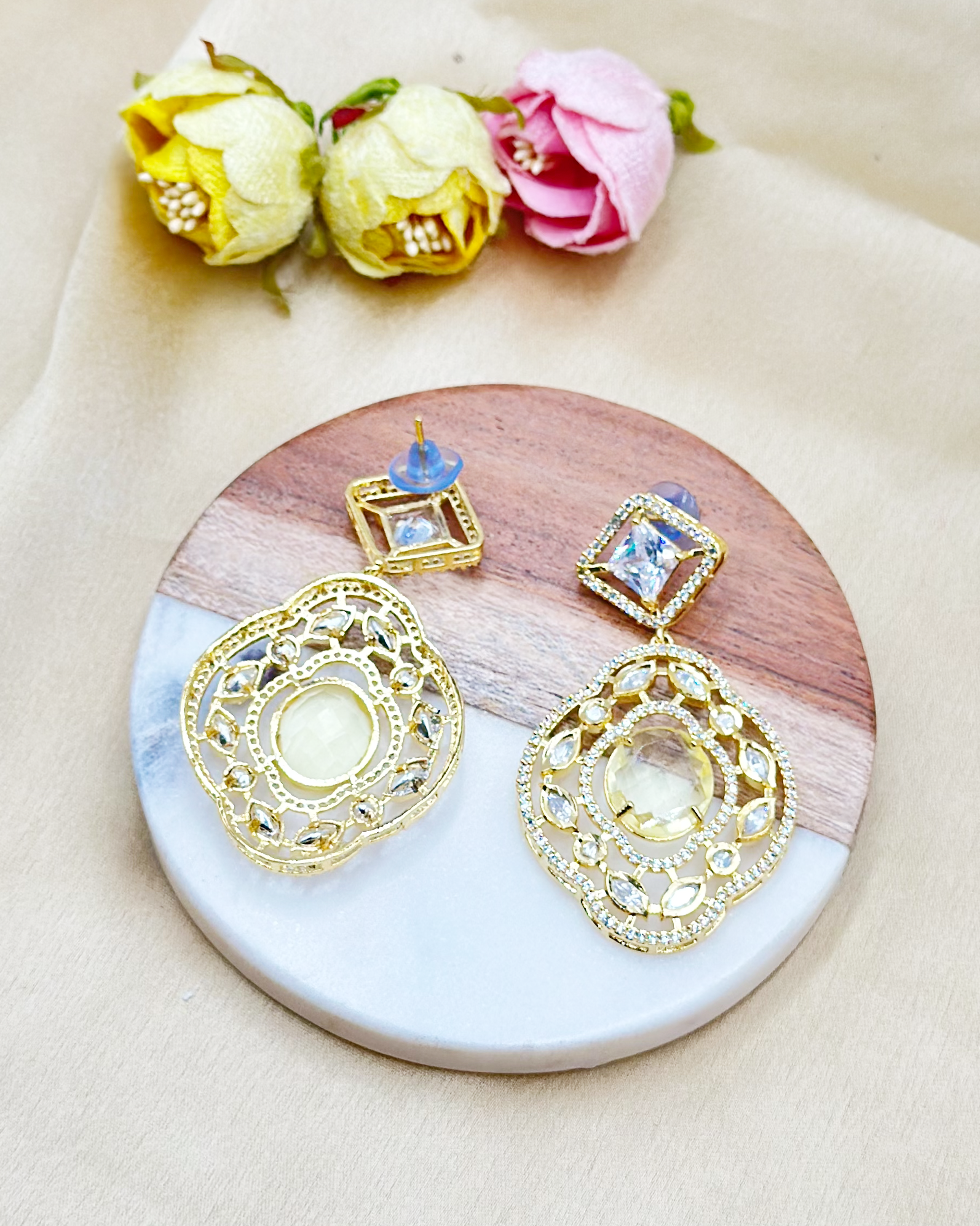 Set in polki and uncut diamonds, these earrings feature a captivating golden yellow color to add to your elegance and sophistication