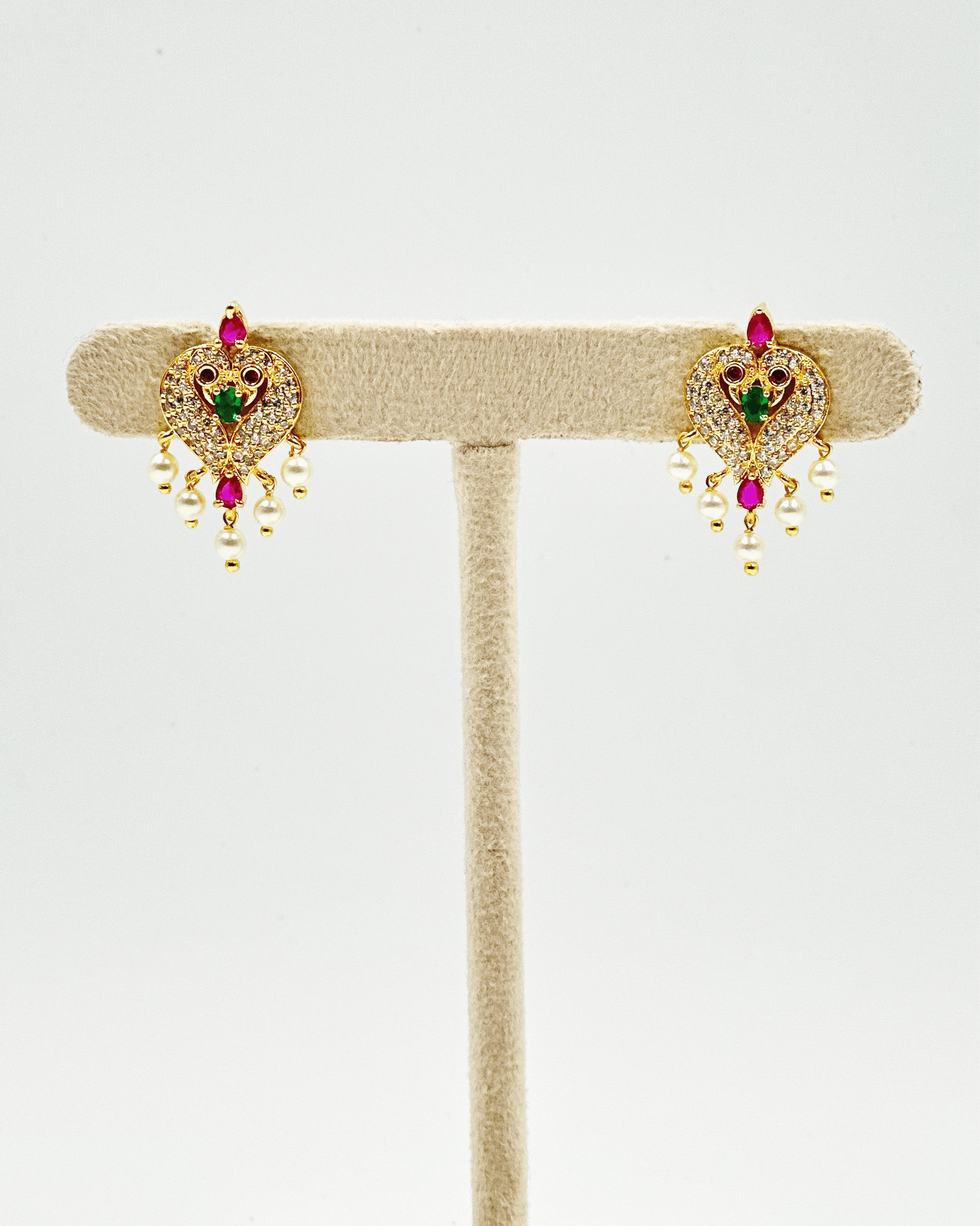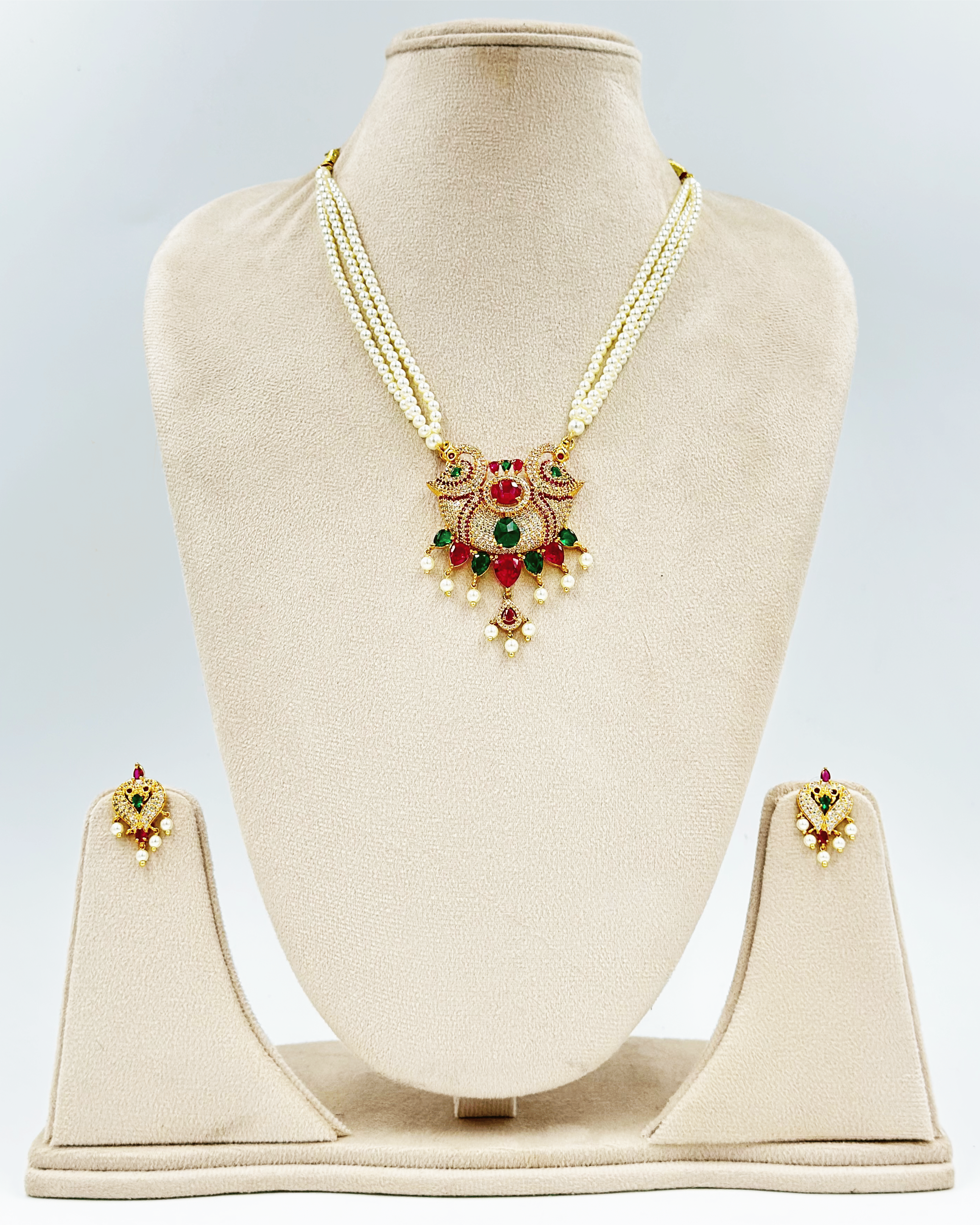 Adorned with luminous pearls and a dazzling pendant featuring sparkling CZ diamonds and vibrant red and green stones, this necklace is the perfect accessory to elevate any outfit.