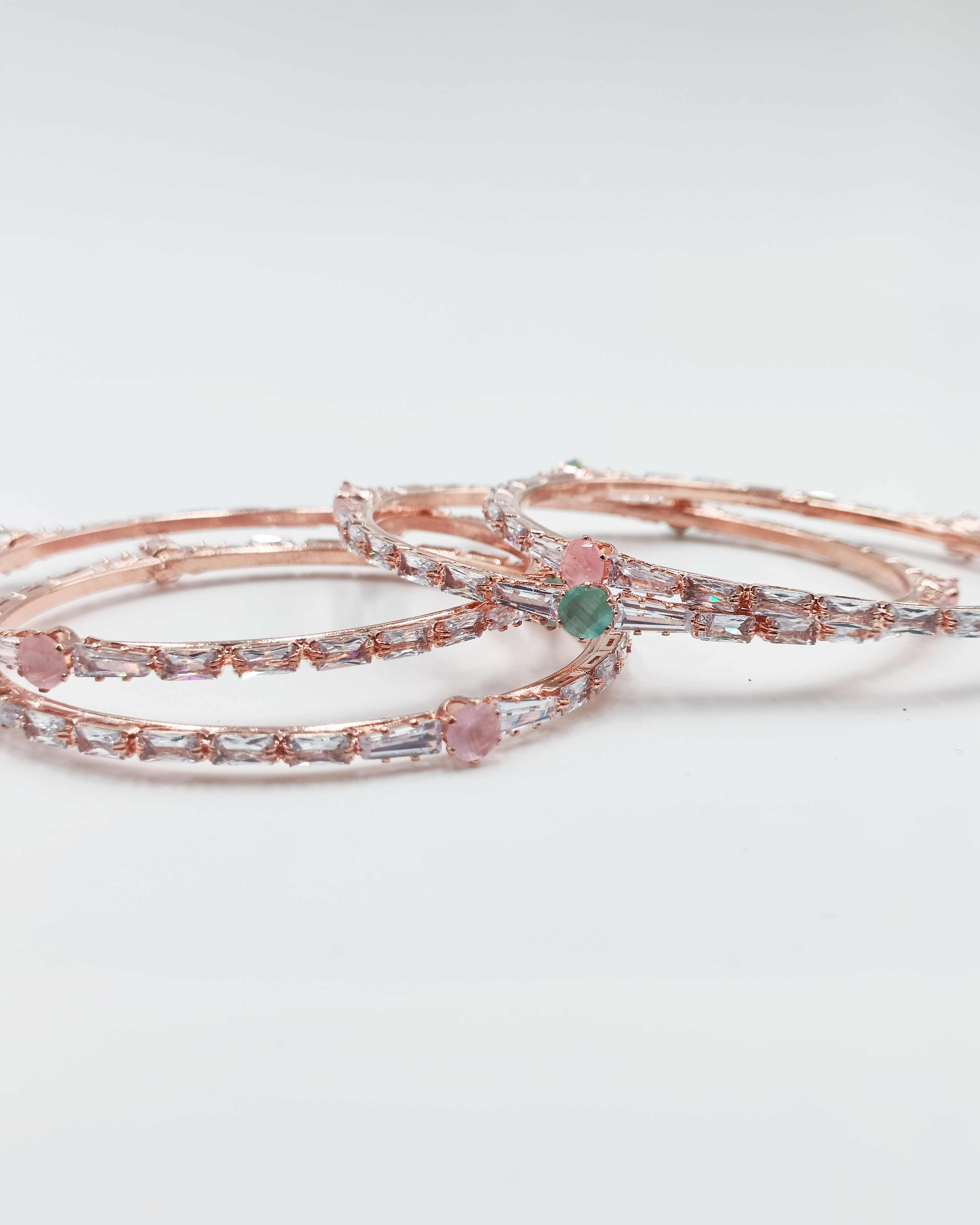 Crafted with exquisite pink and light green stones, these bangles offer a captivating blend of colors and textures.