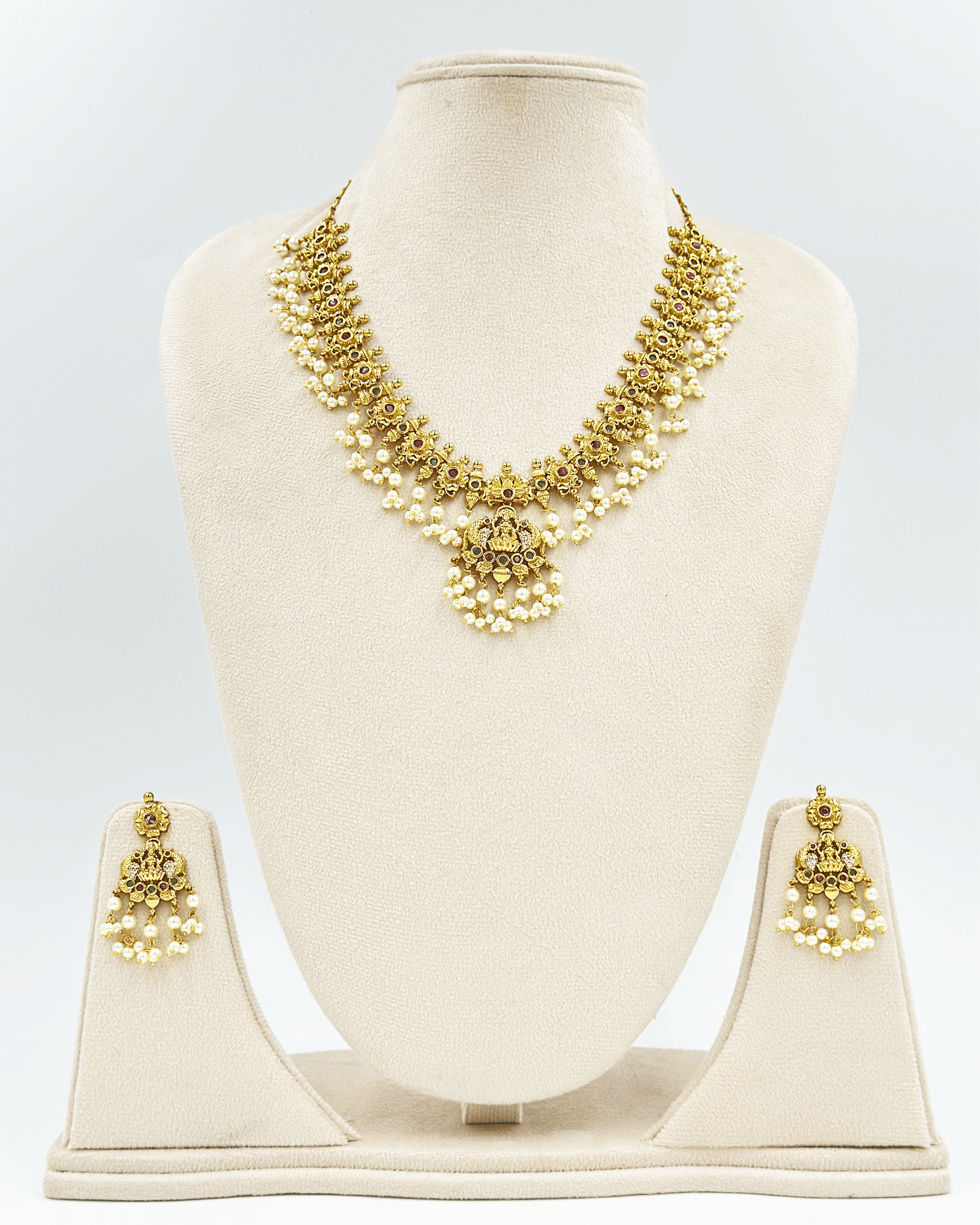 The Vibha Necklace Set is a breath taking tribute to India's rich heritage of temple jewellery.
