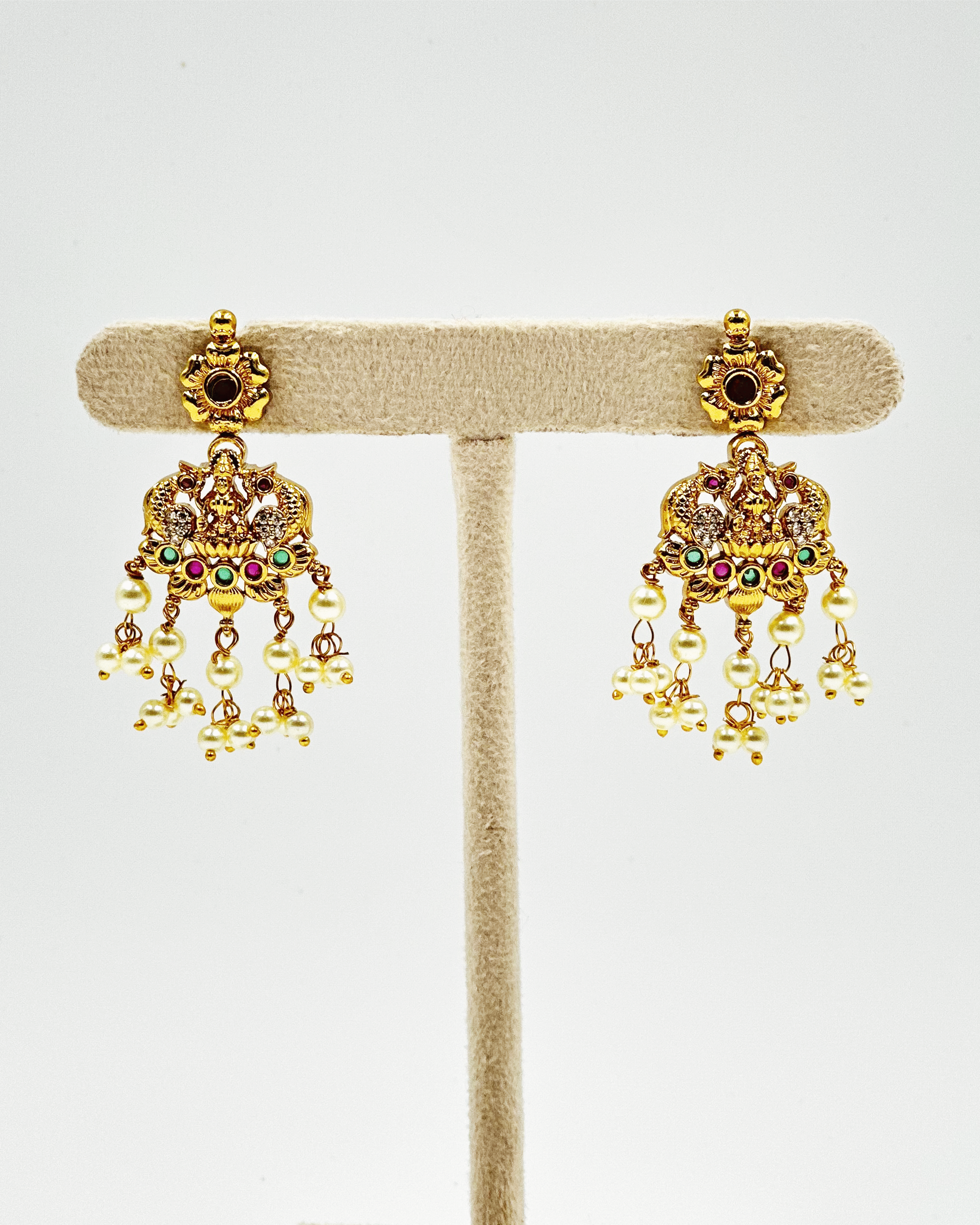 Inspired by the intricate designs and divine beauty of ancient temples, this ethereal piece is adorned with vibrant red and green gemstones and delicate pearls.