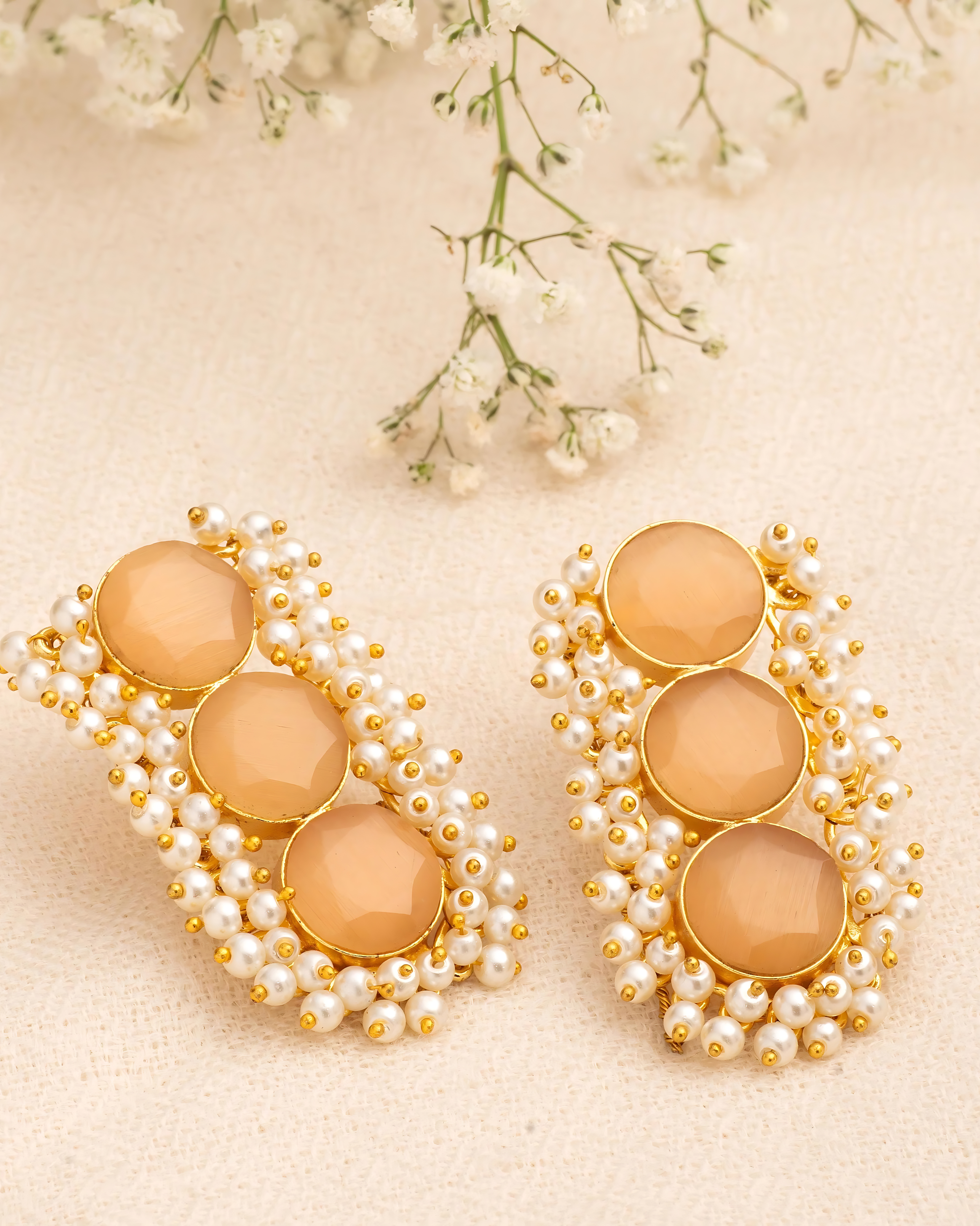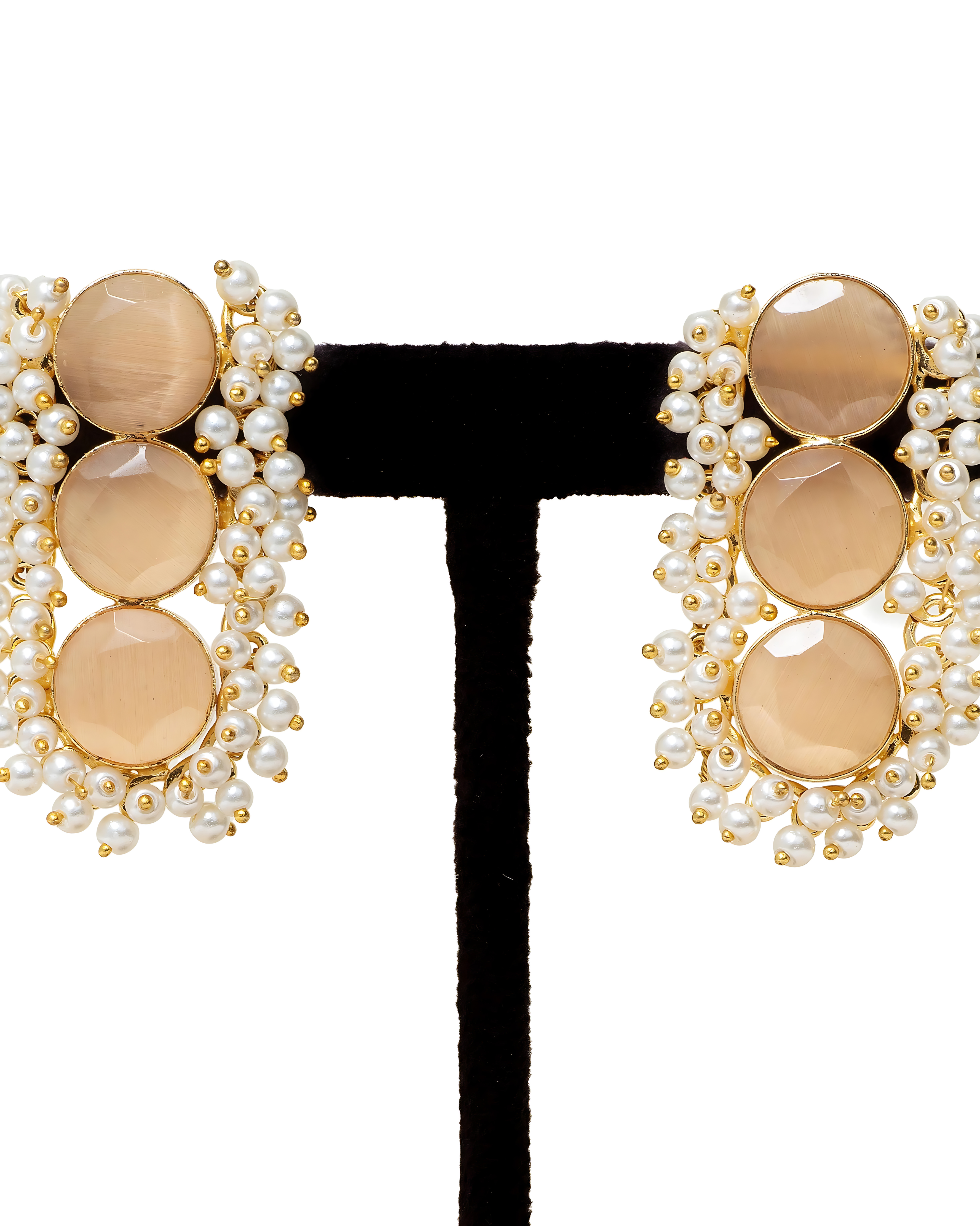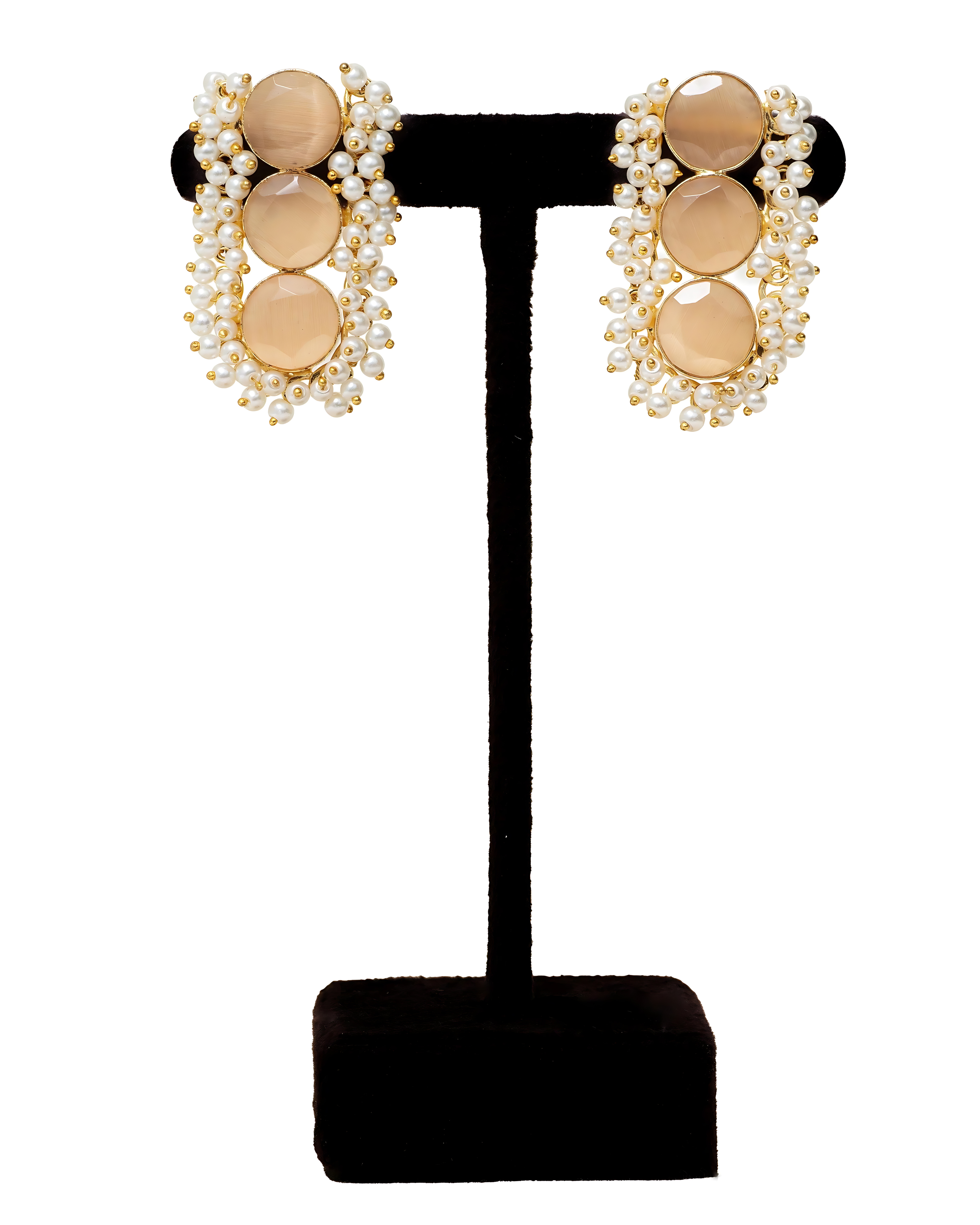 Zeenat Earrings are a stunning combination of ethnic and contemporary design, featuring intricate pearl detailing. These beautiful and lightweight earrings are the perfect accessory for any occasion, showcasing a unique and designer look.